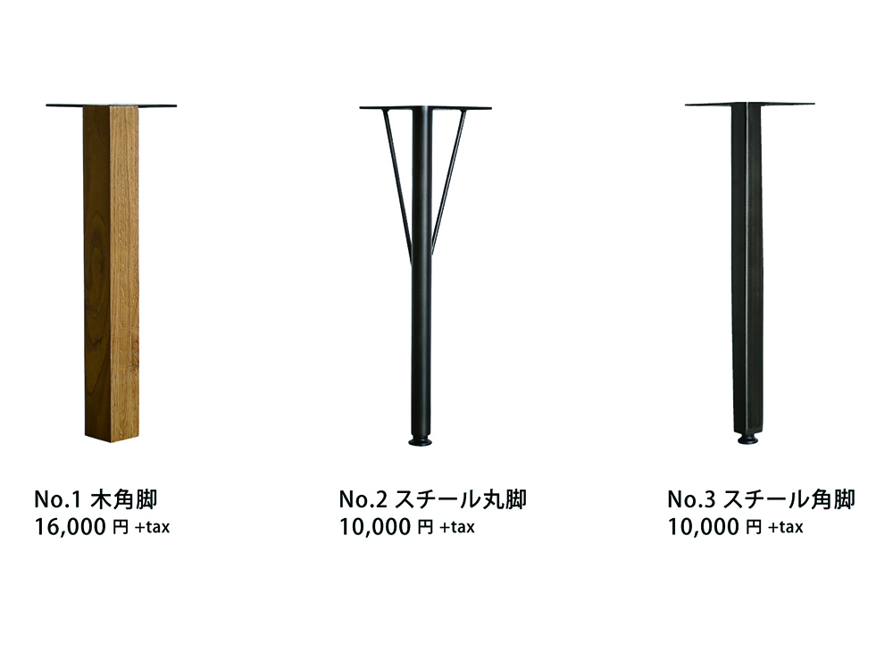 Gipsy Table Leg 1 木角脚 Price 14,300yen(税込) 2 スチール丸脚 Price 14,300yen(税込) bR スチール角脚 Price 14,300yen(税込) |