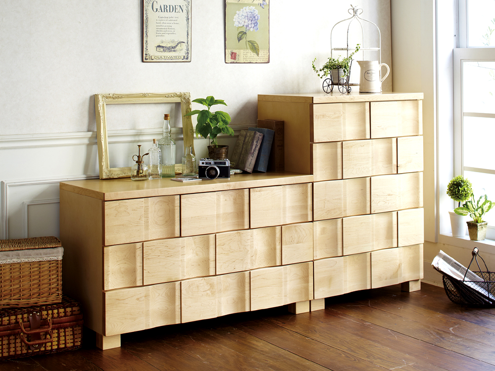 Wave Chest 105-3 カバ無垢材(NA) 幅1052×奥行き450×高さ630 price 82,500yen(税込) ※最上段3つ割れ引き出し 送料無料 |